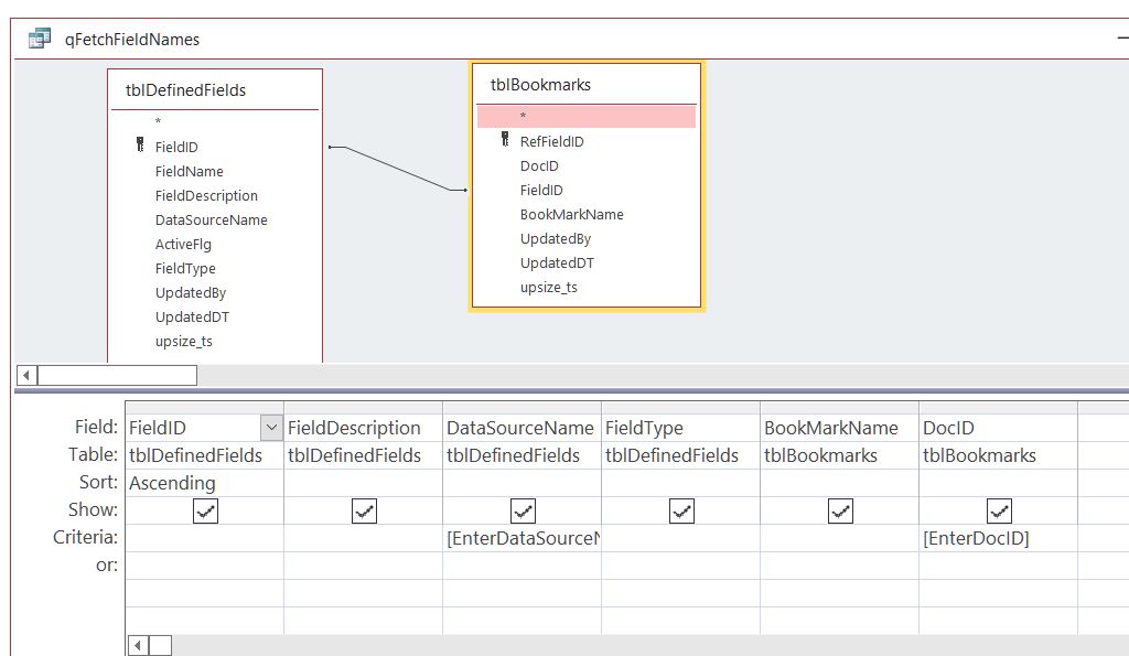 The query here is the one that pulls the list of bookmarks for a specific document. The two tables in the query are the list of all the defined fields and the bookmarks mapped to a specific document. The Parameters provide the criteria. [EnterDocID] is the parameter that specifies which DocID we want from the bookmarks table and [EnterDataSource] is the parameter that specifies which fields we want from the fields table. The two tables are joined on FieldID. this is a partially complete sample so it isn't quite how the next sample database will work but for now it will be OK. The "tblMembers" is hardcoded in the sample code. Replace this with the name of the table or query that will pull the data you want. I think it actually isn't used. I think the recordsource is also created from a hardcoded query. You should see that later in the FillFields GoSub.