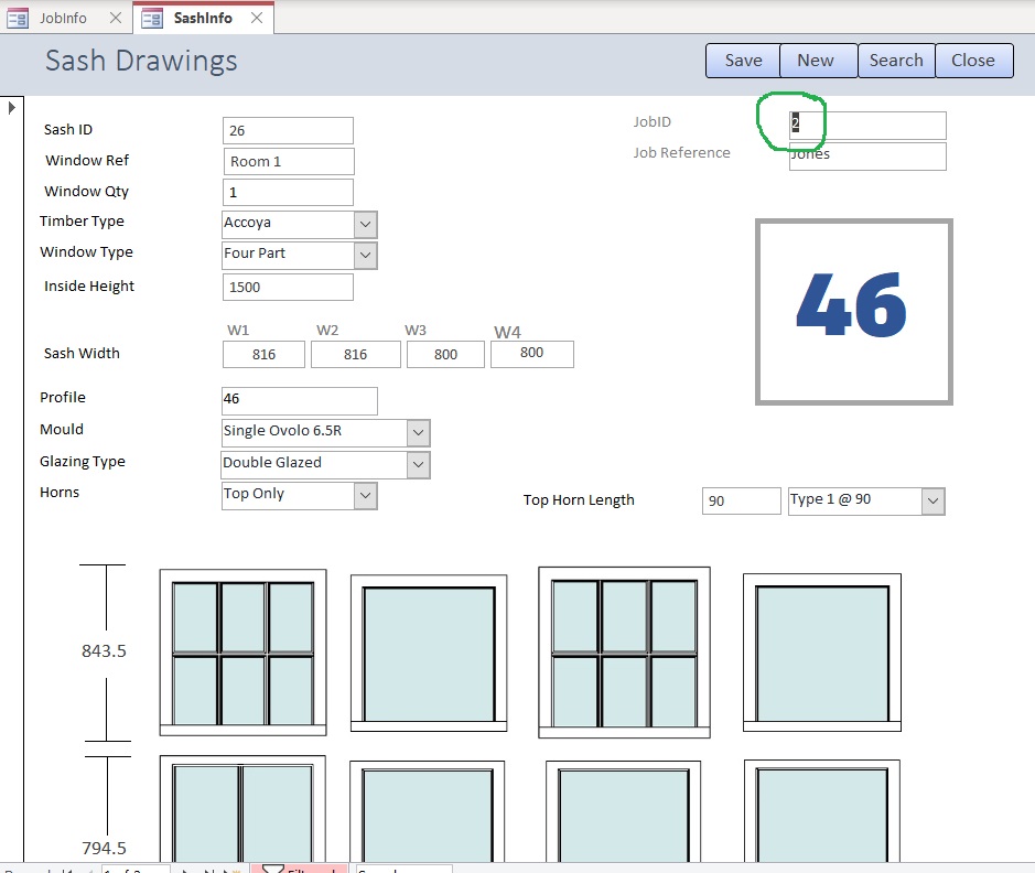 I have a Form Called "JobInfo" and a second called "ProductInfo" they are linked by a JobID field (which exists as an AutoNumber in "JobInfo").