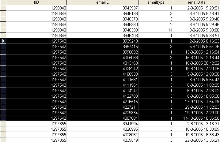 I would like to create a query that shows per tID the total of days between the e-mail from the customer and the e-mail from the company (between emailtype 1 and 3).