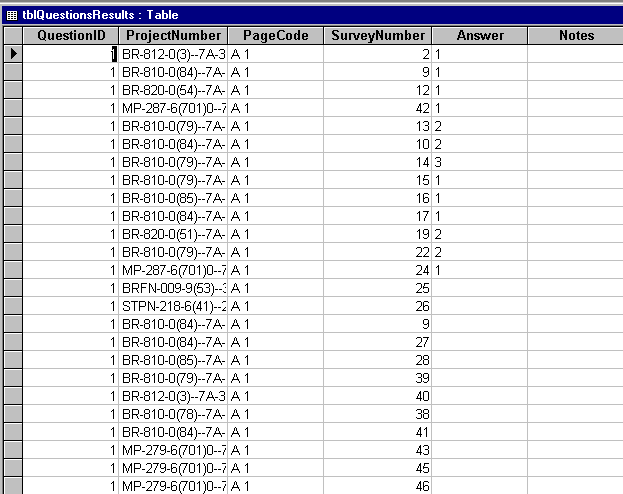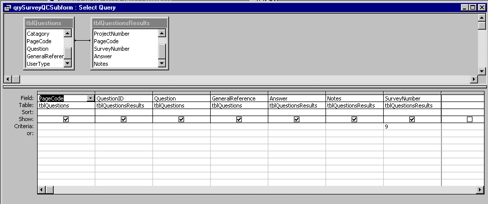 I have a query that sends answers from a survey to a table. This was written by someone who has been helping me to learn Access. For some reason that I am not aware of a "9" was placed in the criteria for Survey Number in tblQuestionResults. The answers in tblQuestionResults only hold answers for survey number "9". I have tried removing the "9" - not a good thing. I've tried >1 - also not a good thing. I'm attaching a screen print of the query.