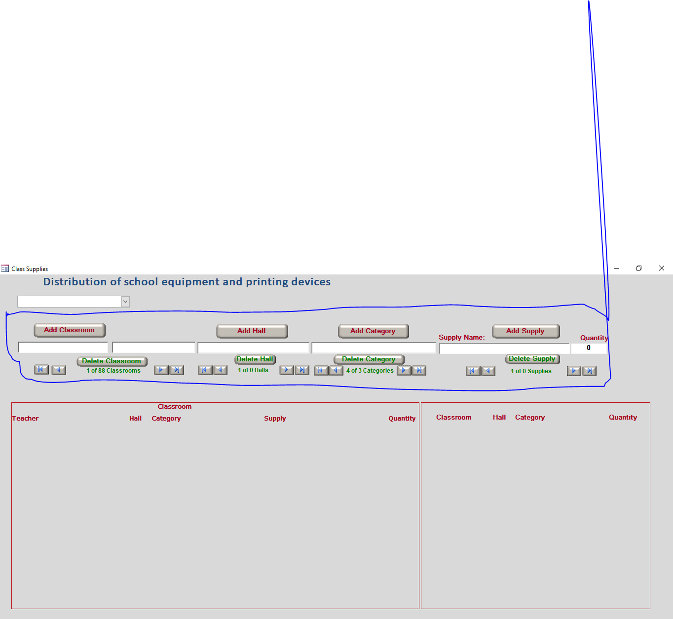 Code:PARAMETERS [Forms]![frmDisplayQuery]![combx] Text ( 255 ); TRANSFORM Sum(SuppyQuantity.Quantity) AS SumOfQuantity SELECT Classroom.TeacherName, Classroom.ClassroomName, Sum(SuppyQuantity.Quantity) AS [Total Of Quantity] ...