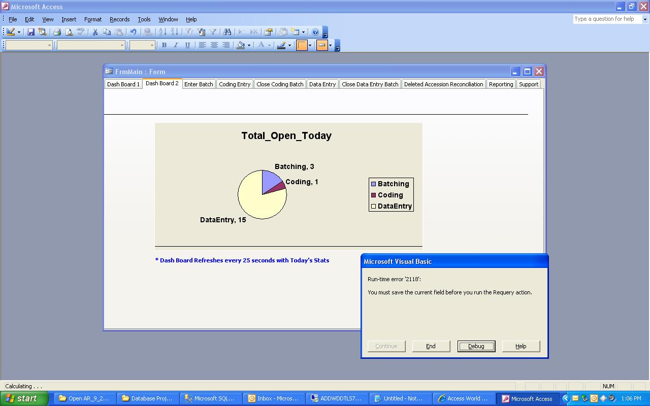 I have two different Subforms (Graphs) that are based on the same table. Basically I am using them as Dashboards that update every 25 seconds. As long as the focus stay on the 1 rst Dashboard there are no problems but once I click on the Tab that has the second subform I get RunTime Error 2118 'You must save the current field before you run the requery action'. I attached a SnapShot view of the error. Below is the code I am using in the Timer() Event.