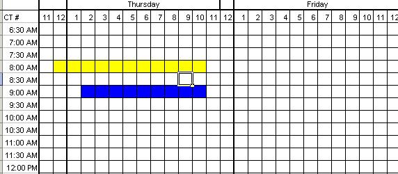 I've attached a picture that I want to accomplish. It's in excel, and I'd like to create an access form so we have a database backend. I have the calendar access program built, but need some input on how to make a grid work with color coding. Any resources or keywords I should search on?