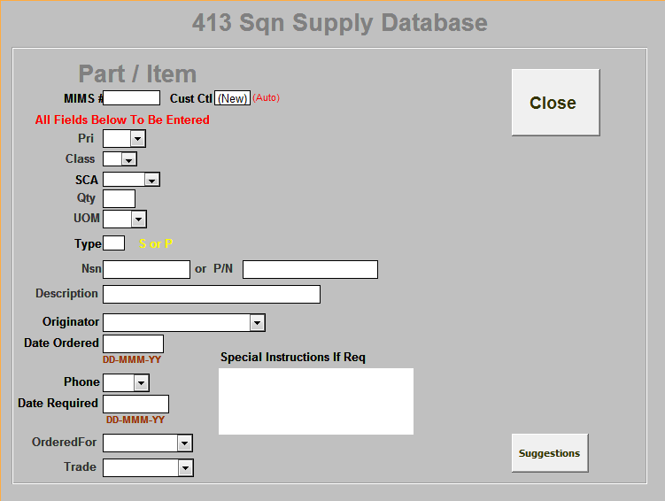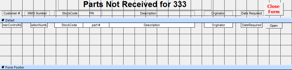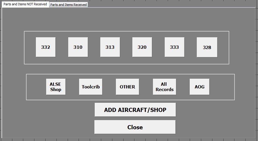 I work for the Canadian Forces, and I require to create a database to keep track of what parts have been ordered and received for each aircraft (3) and some support shops. (ALSE, TOOL CRIB, OTHER)