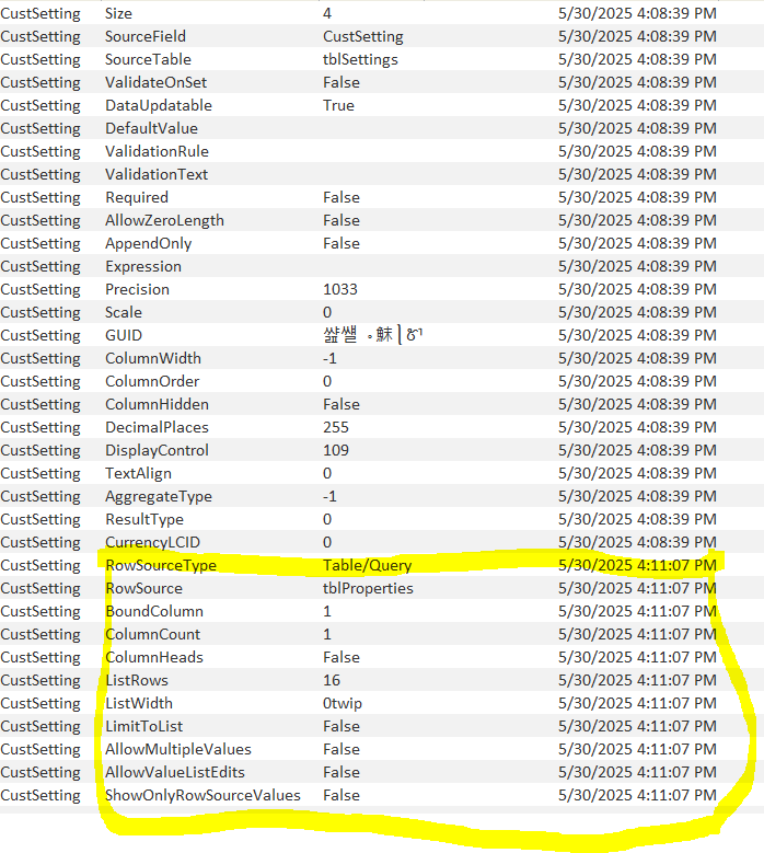 I changed the display control of the field from TextBox to Combobox and re ran the code to insert the Properties. It created additional properties shown in yellow as a result of changing from textbox to combobox. Again these properties did not exist. If I searched for Rowsource prior to changing display type it would not say the value was null, but say that the property does not exist.