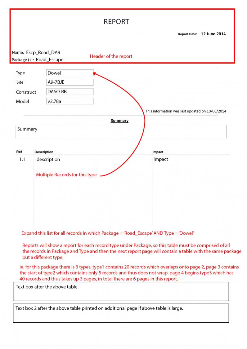 I want to create a dynamic report about each package so I have a page "header like" section which contains information from table 1. THEN I would like a table under this which contains the columns in table 2 WHERE Package Name from table 2 = Package name from table 1