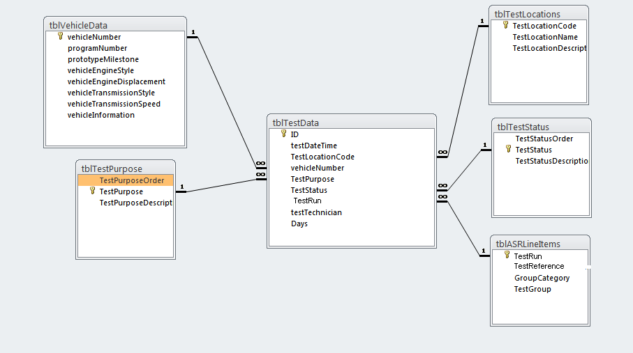 So the goal of this DB is to track the testing of various experimental vehicles. Each step or "testPurpose" and "testStatus" is logged, and a new record is formed everytime another "testPhase" begins as well as changes in the "testStatus", ie intrumentation, testing, etc. The overall goal is to be able to track how long different steps in the testing process take as well as to determine areas where we can improve efficiencies.