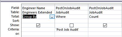 SELECT [Engineers Extended].[Engineer Name], Count(JobAudit.PostOnJobAudit) AS CountOfPostOnJobAudit