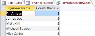 Once this is working, I would then like to use this query to display the total on job audits in the engineer details form.