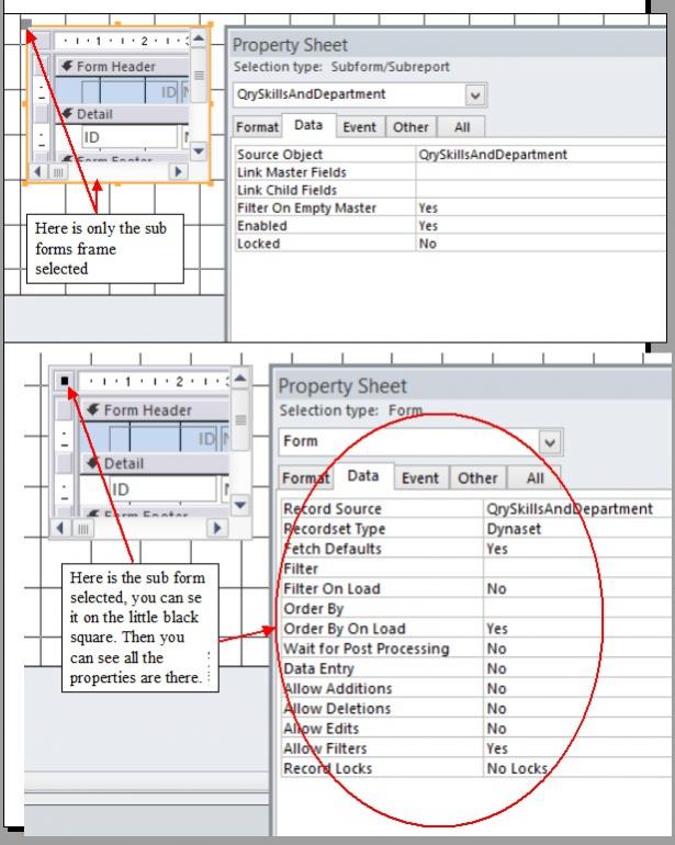 then in design mode of Main Form I clicked on subform control in create mode and created a subfom within the Main Form. Since the subforms were created in the Main Form there is only one Form property for all three forms, instead of a form property for each that can be set separately.