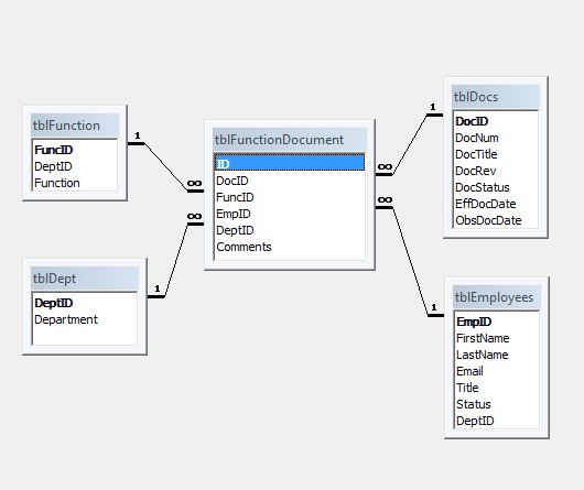 tblFunction - this table contains the training modules within each department. Example QA dept has 6 modules, QA General, QA Manager, Auditor, Doc Control, etc