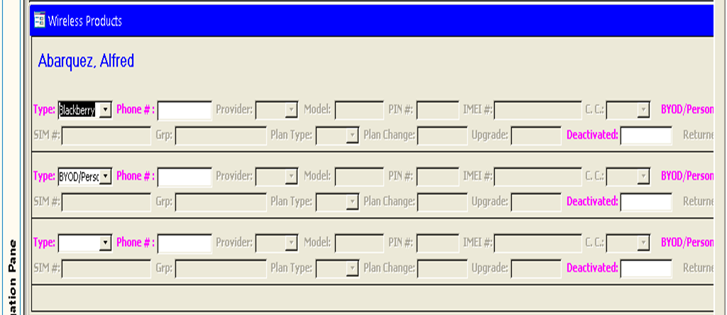 I have a continuous subform recording the information of various wireless products for an employee embedded in an employee main form. Please see screen shot enclosed.