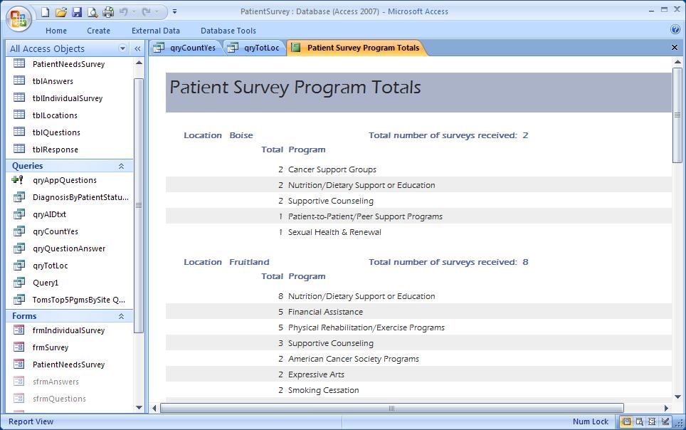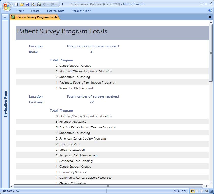 I have created a report to display data from surveys. The report shows the location the survey was taken and then (by location) the count for every program wanted.