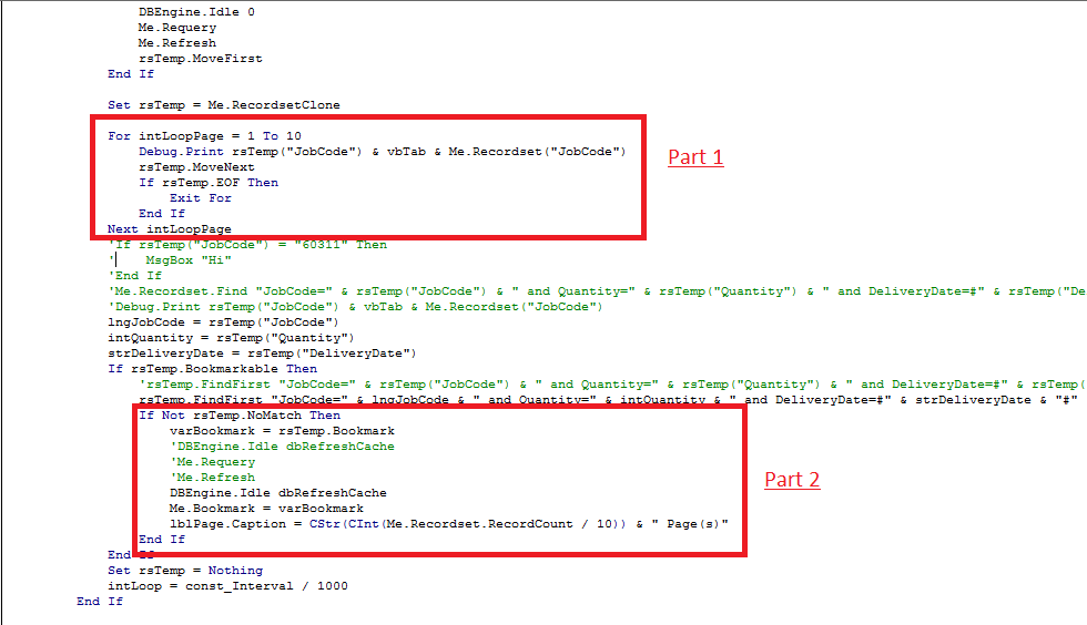 To do this, I am using a recordset to move at the back and recordset is moved next through 10 times of looping. Recordset is then bookmarked and linked back to screen before it is displayed out. You may need to see the attachment for further understanding.