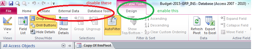 Nevertheless! my client has a DB with a Custom ribbon that disables everything but the Home tab. However this kind of cripples the users when it comes to a Pivot form they have - as the Design tab is hidden, they can't add new fields or export to Excel or anything. So they need it enabled while having all the others disabled. I was wondering if anyone's ever accomplished something like this before? I don't have much experience writing custom ribbons, and some ideas or maybe an example of something that explicitly enables the Pivot form Design tab.