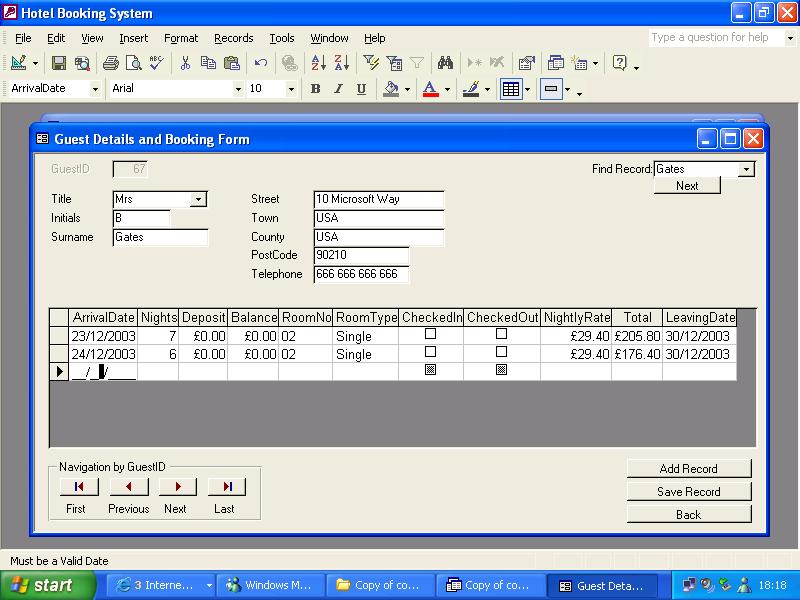 I've put this in this forum because it doesn't strictly fit into any of the others. I' want to attatch a copy of my coursework with only the relevant tables and forms, no idea how though. Basically its a room booking system for a hotel but I can't figure out how to stop double bookings from taking place. A friend suggested to make some code so that each individual day would be booked rather than a specified time period making validation more straightforward. If you could help me to stop double bookings from taking place please help. Bear in mind my VB skills aren't great. Thanks for your help.