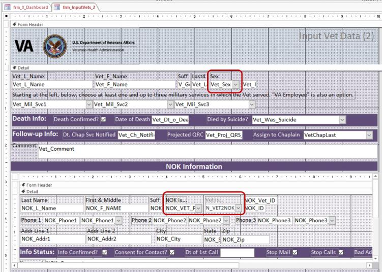 In frm_InputVets_2.Vet_Sex, the user will select the sex of the deceased Veteran, from a list that is inherited from the table's field parameters. The control is bound to the field tbl_Veterans.Vet_Sex.
