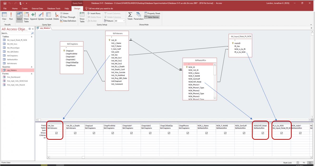 So, I want the control, frm_InputNOK_2.cbo_Vet2NOK_Relat to draw the Veteran's sex from frm_Input.Vets2.Vet_Sex, and the relationship of the next of kin to the Veteran from frm_InputNOK_2.NOK_VET_Relationship, and filter the table, which will produce one and only one option that can be selected to enter in the control.