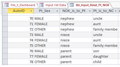 In frm_InputNOK_2.NOK_VET_Relationship, the user will select from a list the relationship of the Next of Kin to the deceased Veteran. (This information is found in the Veteran's medical record. The user selects from a list selected by this SQL statement in the Row Source property of the control.