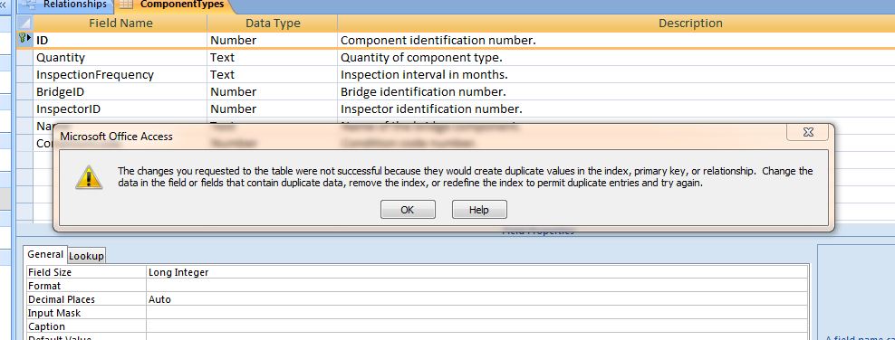 I am a student in applied computing course, we've just began learning access. I had a simple task that I think I've done it, except one error that keeps popping up every time I try to set up a PK for a particular table. Please tell me, what is wrong. I've tried to fix that, following the suggestions in the dialog box, but the error kept popping up. Please open file Capture3.JPG to see the error. Thank you!