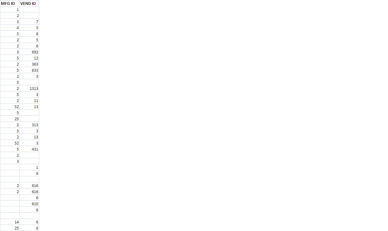 Hi All, I have 2 Columns MFGID and VENDID. where ever MFGID is Null the Corresponding cell Vendid should get updated and VICEVERSA. i have enclosed the attachment of it.