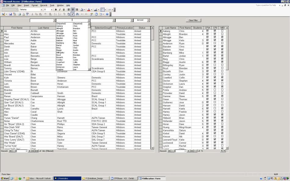 My goal is to add a field to the unbound combo with a UNION join and then use VBA to set the filter to something other than 1 single field. The code in red for the second combo is my attempt at modifiying the CFILastNameField filter to include all the CFI's who aren't current. I'm pulling their CFIID along with the appropriate text for the filter property of the form (shown in 2nd combo code).