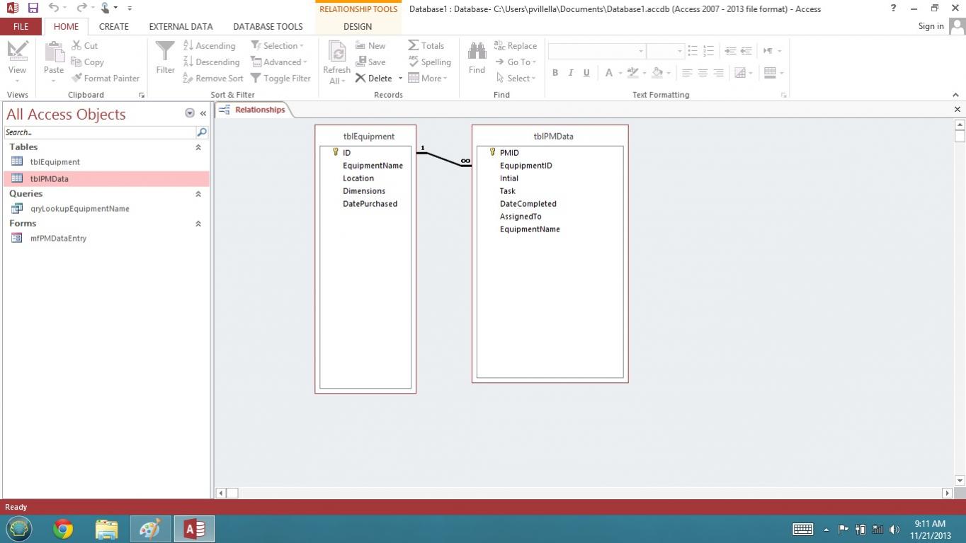 What im trying to do is make a Preventive Maintenance Database. I want one place to enter all the equipment and another where you enter the tasks that need done and the date it needs to be completed by. Then also do a report for what needs done in the month of December etc.