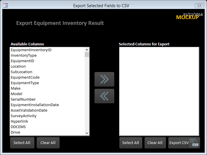 Is there any way to 'Export' the selected column (user selected columns) as CSV. I have attached a mockup (screenshot) that gives a clear thought about the scenario. The 'User' will be able to select the 'Columns' for the export of 'tblInventory' and by clicking 'Export as CSV' button will export the 'Selected' columns as CSV.