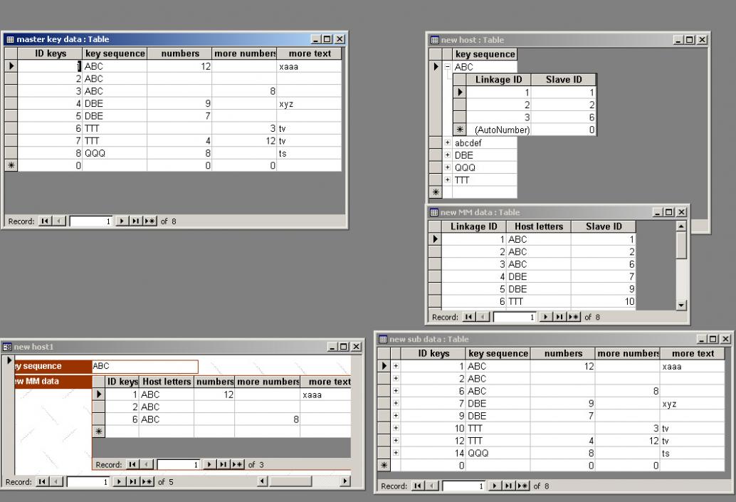 I have a friend who collected hundreds of surveys from different college dorms across the state. Instead of asking me to database it all for him, he decided to give it a shot himself. He's wound up putting everything he collected into one single table, complete with duplicate dorm names and rooms down the columns, and everything filled out sideways. I offered to fix it but I'm stumped. The topleft table is roughly the format he's put the surveys in; the three tables on the right I created manually to try to work backwards to a solution, and the form is based on the basic query of those tables. I want to be able to turn the table on the left into something approaching the much better setup on the right. How can I go about it without him having to type everything out again? Thanks a ton.