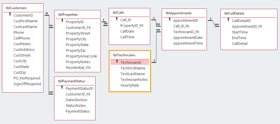 If you are going to use forms and sub-forms (which I prefer) then the design will give you a logical sequence by which you learn which form is a subform of which parent form. I have taken MajP's design and rearranged it so all of the primary keys are on the left and foreign keys on the right, so the design is read from left to right: