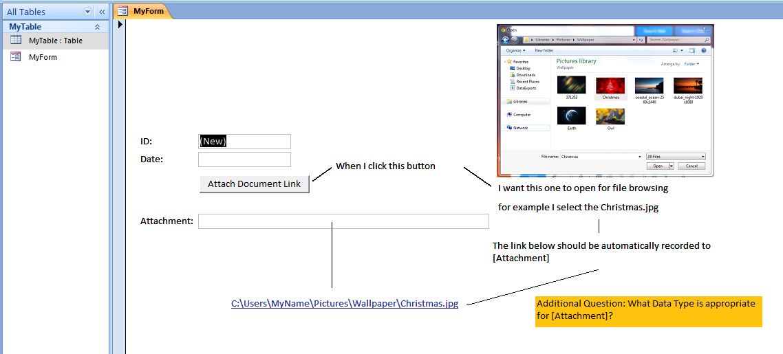 It is possible to save it into the attachment field but it's not necessary and certainly not advisable. See the attached link how it should be done: http://support.microsoft.com/kb/285820 As for opening the dialog for selecting a file, scour the net for FileDialog.