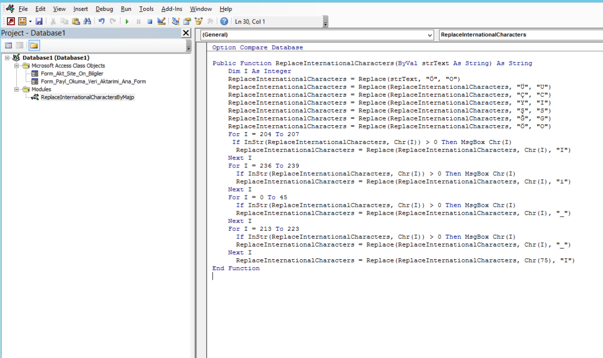 If InStr(ReplaceInternationalCharacters, Chr(I)) > 0 Then MsgBox Chr(I)