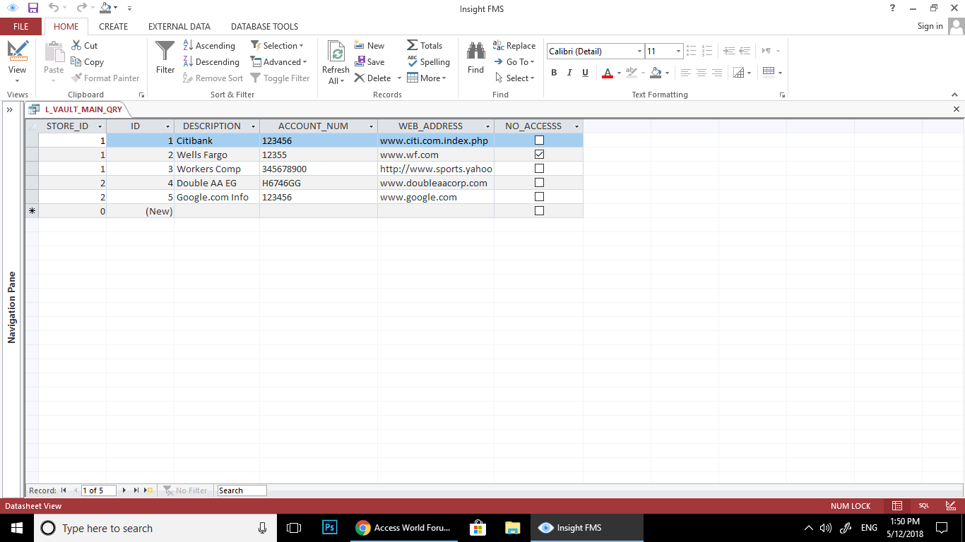 SELECT L_VAULT_TBL.STORE_ID, L_VAULT_TBL.ID, L_VAULT_TBL.DESCRIPTION, L_VAULT_TBL.ACCOUNT_NUM, L_VAULT_TBL.WEB_ADDRESS, L_VAULT_TBL.NO_ACCESSS
