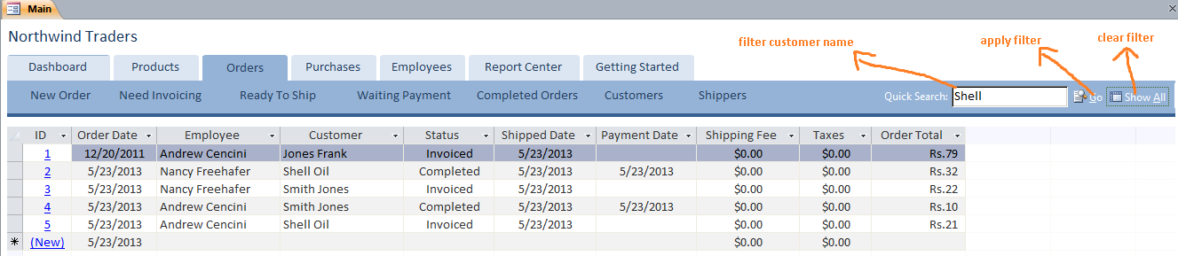 Hi sigma788. I've attached an updated version of your DB. I placed a control on your main form and as you type it will filter the Active Orders. It takes advantage of the Key Press event to capture what the user has typed and saves it in another hidden control that is then used in the record source for the Active Orders as the criteria for the Company field. The filter does not consider context, just exact matches found within each text string. Let me know if that will work for you. For your other subforms you will need to add the criteria.