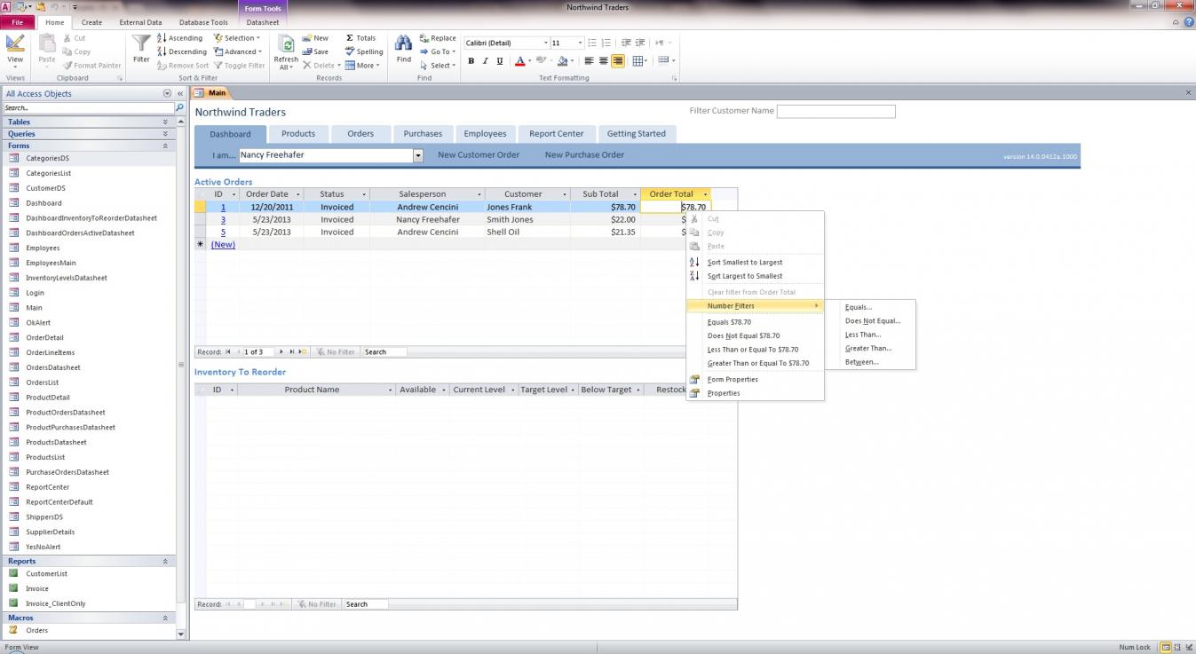 Are you looking for a permanent filter or a temporary filter? Have you tried using the Filtering capabilities that are built in Access, i.e, select any of the Order Total fields, right click and select Filter?