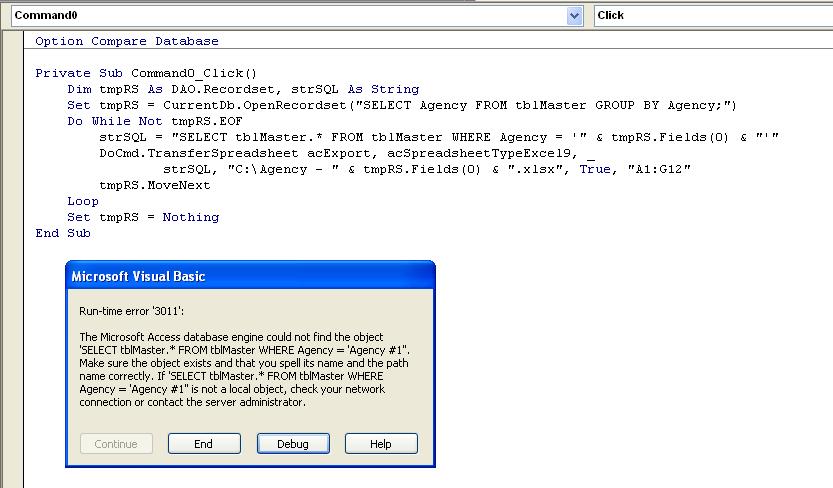 I have suggested a combo-box on the Form that passes the Agency name to a query and then exports (so they could have control of which Agency to export) but no - they just want one click, spool through the table and create the 35 (or so) exports.