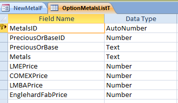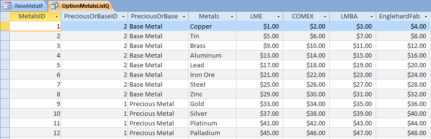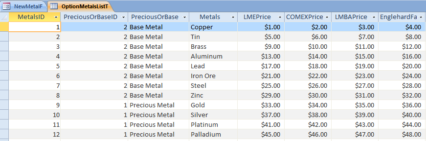 Here is a screenshot of the table with all of the metals and their market prices filled in with dummy values for now:
