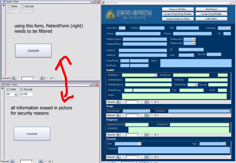 what i have is a form (image attached) and i need to be able to select any combination of parameters (including state, zipcode from GENERAL, i.e. referring doctor last name from RefMD, Drugname from Drugs, Diagnosisname from Diagnosis, and VisitType from Encounters) and filter PatientForm where all the selected parameters are true..