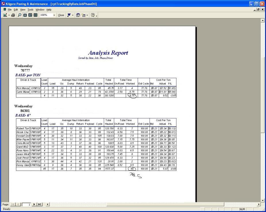 I have a report that groups by Date, Job #, Phase #, Unit #, and then Hours. I have a field in the footer under Hours that is supposed to sum the total hours for that group. And it works fine if there is only one job on the report or for the first job on the report. But if there are two or more jobs on the same report then its starts including the last job's hours in the sum. I have attached a screen shot of a two job report. The total at the bottom of the second job is off by two times the total of the first job. This is consistent. If there were three jobs on this report is would be off by two times the total of the first two jobs.