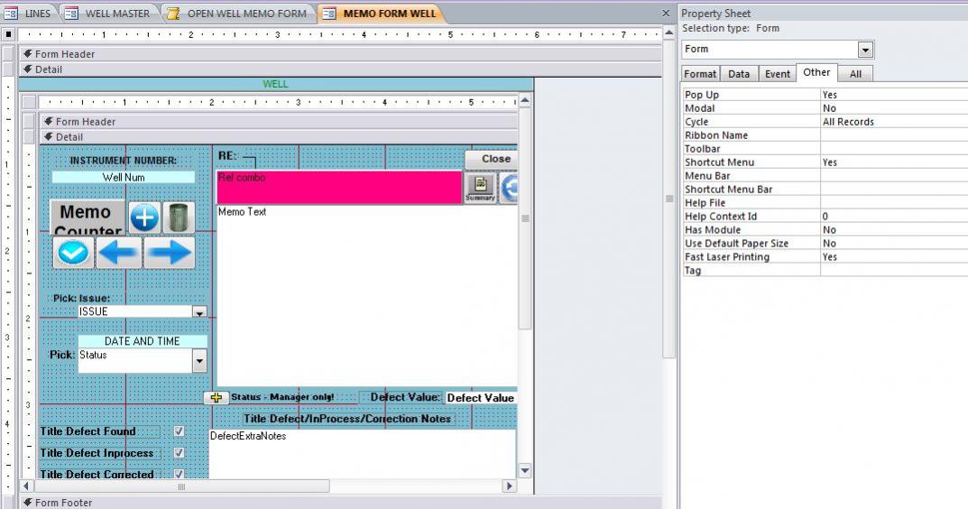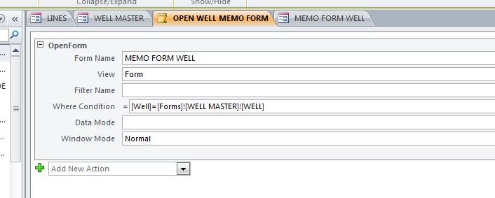 I am fairly new to the Access world and i have run into a problem with my macro enabled button. The forms name is called Well Master and has an autonumber every time a new record is created. All this information is fed to a Well-Master Table, but here is where I am getting into problems. I have a macro enabled button that launches a note feature so someone can write a note on the well, but the table that holds the note is in a table called Memos. When I press the button I want it to take the well autonumber and attach itself to the memo for population into the other table, but it is not happening. It will allow you to fill out everything on the form but without having the well number you can not tell what the note is attached to. So it goes to the table but is not attached to anything. It seems that when I change my where clause I get a lot of different results, so that is where I feel I am failing. The form is called Memo Form Well but the information for the note is within a subform called Memo Form Lease Well. Can you see anything wrong with my macro and help me get this working?