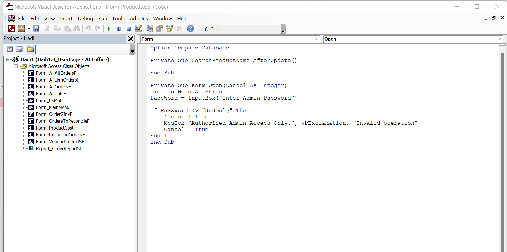About to disperse front end to users. clicking through to make sure everything worked and noticed all the passwords that were added in the form property / events are gone. pic of code attached. I cant add them back in accde file. how do I require pw for those forms? sorry, new to access... i googled a bunch before asking but couldnt find an answer.