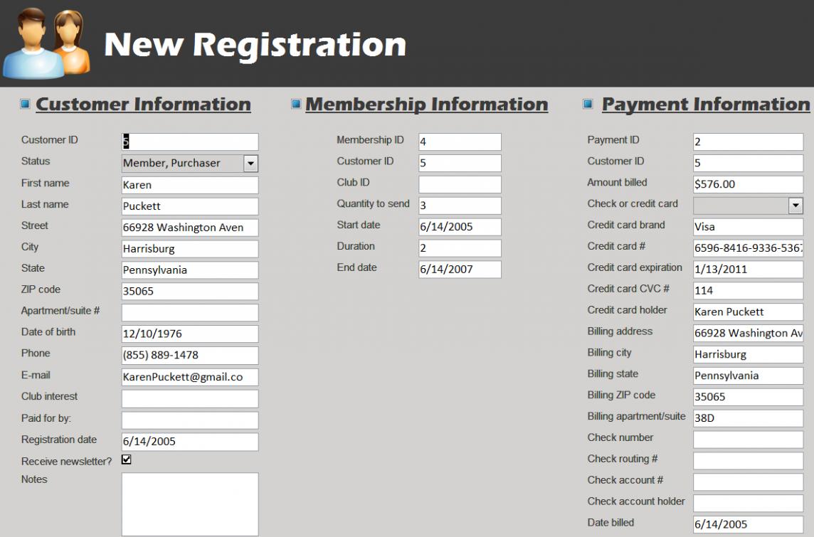 I'm trying to make a form that will accept input fields that will store data in 3 separate tables. This is for a hypothetical business that is setting up a registration for a new customer, and they are trying to store data regarding the customer's personal information, purchase (membership) information, and payment information.
