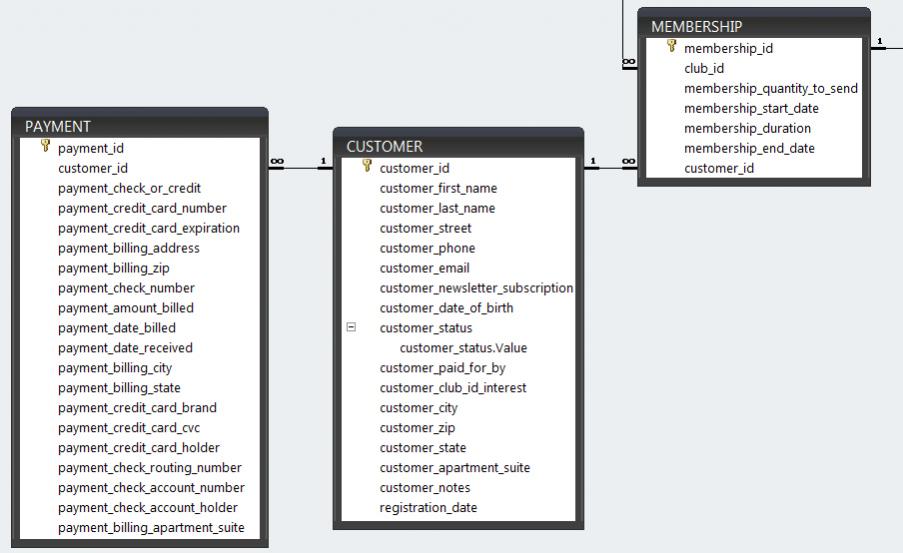 Thus, the 3 tables are Customer, Membership, and Payment.