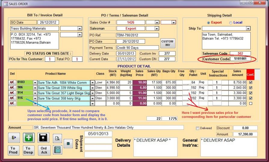 I want to display last (latest) price in a text box called TxtOldPrice. If the previous record is avalable for this customer for the selected item entered in T_SOFooter1, it would display in this TxtOldPrice......just for reference only.