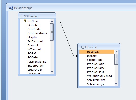 I have 2 tbls called T_SOHeader & T_SOFooter1 with one to many relationship which is InvNum.