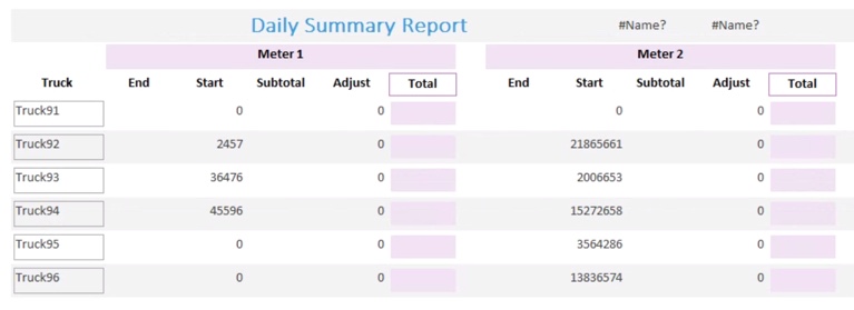 As shown in the attached photos, I have a table where a user enters meter readings for each fuel truck after each day. Each truck has two meters.
