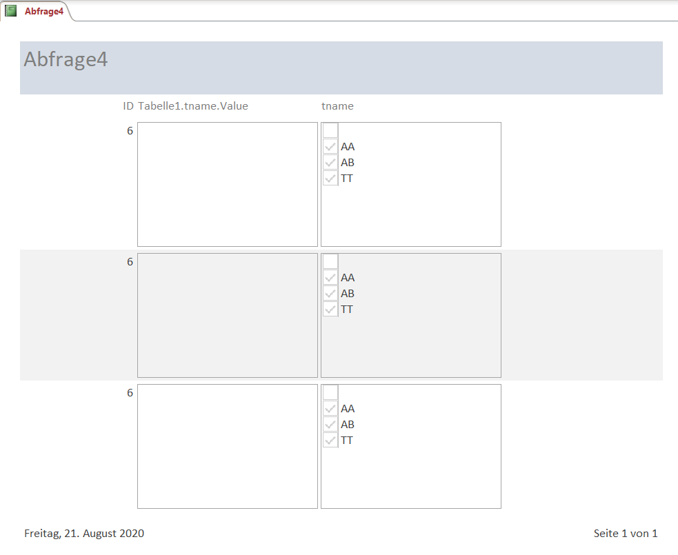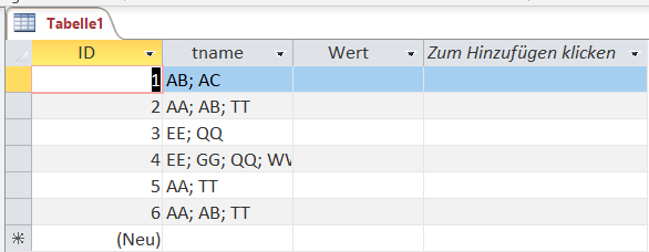 I've a db with table(Tabelle2 mitarbeiter) for all employees and a table(Tabelle1 tname) to save who worked together. Now I want to create a querry that shows only the last dataset. I tried it with Max(ID) and Last(ID). Hopefully someone can help.