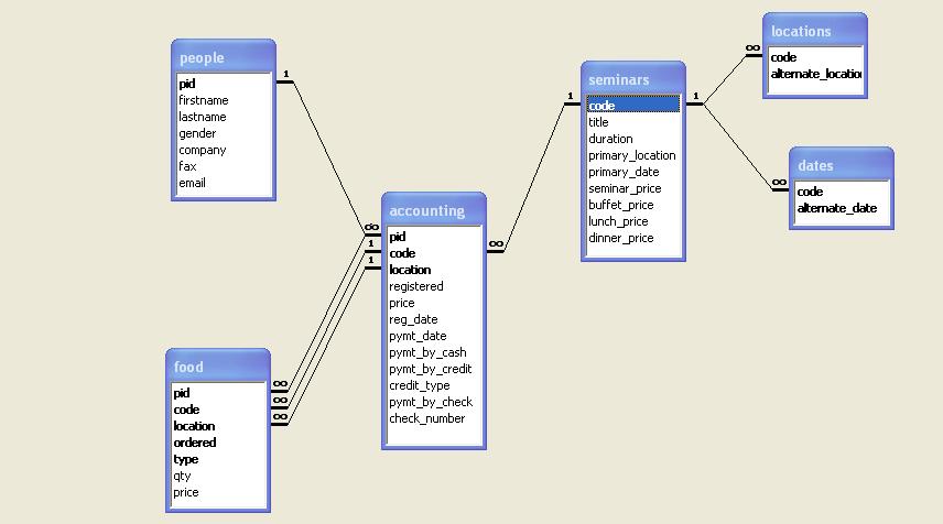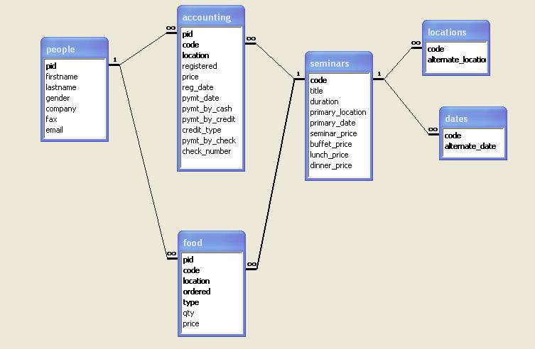 Can someone please tell me if the table relationships are OK.. I have a database which stores people's information and the seminars they have registered for.. Every seminar should have a primary location and date and could be broadcasted over several alternate locations and could run for one or more days at a stretch... Now I am storing the registration information and payments made in "accounting" table and meals (buffet, lunch, dinner) ordered in "food" table... Since meals could be ordered for more than one day if a seminar runs for multiple days, should I have the "food" table as in RELATION1.JPG or RELATION2.JPG