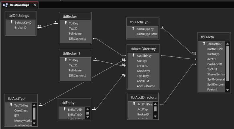and it is a "single form" with record selectors, you can either edit or add transactions. However, there are rules about what is acceptable in each field depending on the setting in other fields. These rules are too complicated to put into control validations, and even if I did that would severely limit the order that the items could be entered (entry would become a tedious process with error messages popping up). For instance, for cash-only type transactions (deposits/withdrawals) the shares must be 0 and there should not be a "security account" entry (I guess that could be ignored with that transaction type when doing the account and statistic calculations later). For dividends, the shares must be 0. For all transaction types that are not splits the numerator and denominator must be 1.