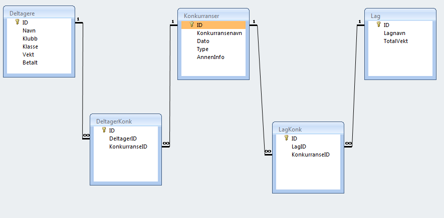 The problem is to connect Lag (Teams) with Deltagere(Athletes) in the form. One athlete can have just one team and one team can have one or more athletes.